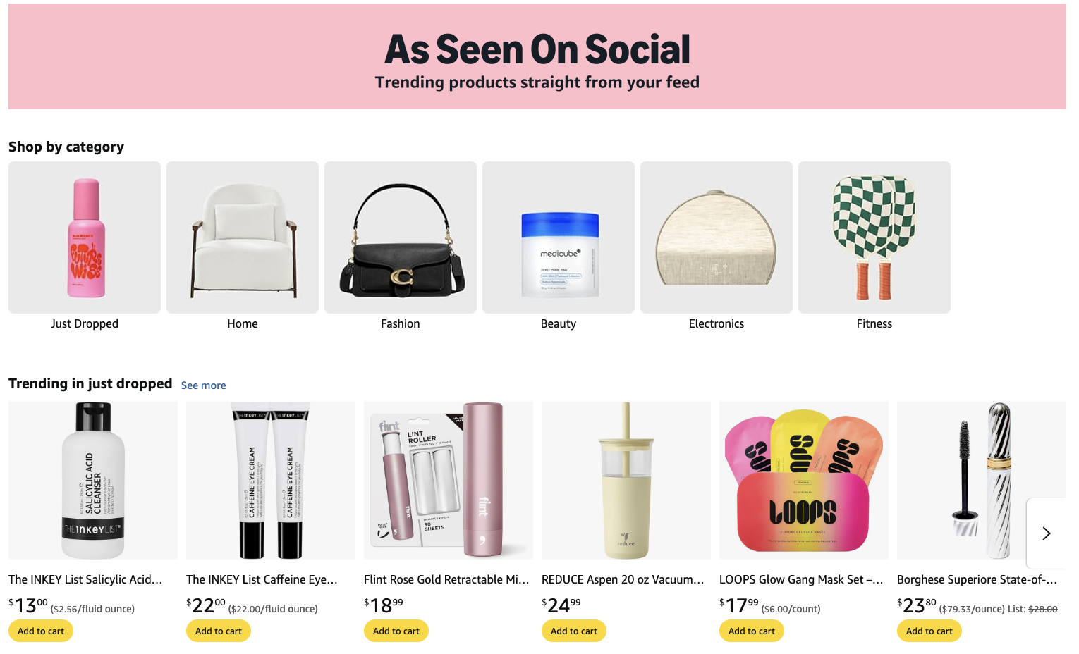 Strategy Developed: Proposed and launched "Just Dropped," a strategic monthly franchise dedicated to curating 3P new seller promotions across Amazon's social channels. This initiative shifted product curation control to the marketing team, establishing a new category string path: "As Seen on Social > Top Just Dropped" to create a dedicated content marketing destination.