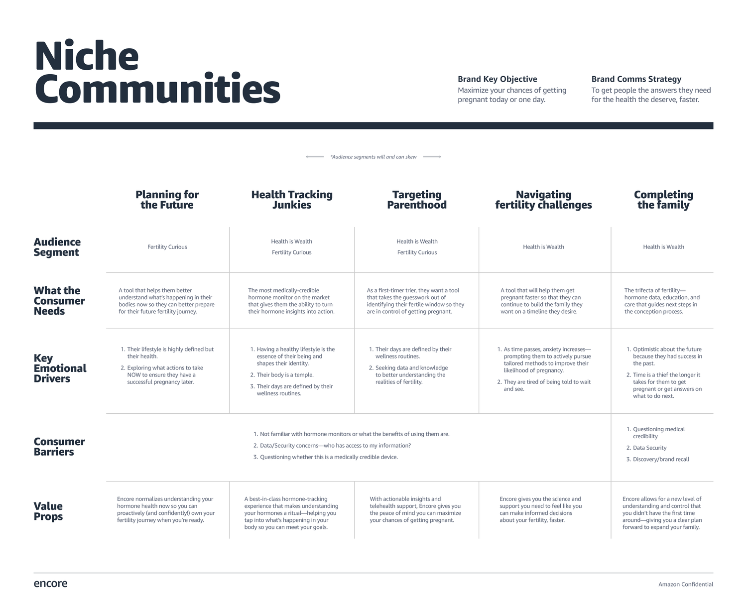 Strategy Developed: Developed a holistic content marketing strategy for Encore Fertility, designed to meet target customers who already spend time across the customer journey and drive sales. The strategy focused on building awareness through educational content, initiating and fostering conversations on social media about fertility, and establishing credibility through partnerships with healthcare professionals and reputable influencers. It was informed by formalized content pillars and newly developed fertility personas to ensure a tactical approach that addressed customer motivations, needs, and barriers. This strategy was integral, extending into and guiding the Influencer Marketing and Organic Social Media strategies.